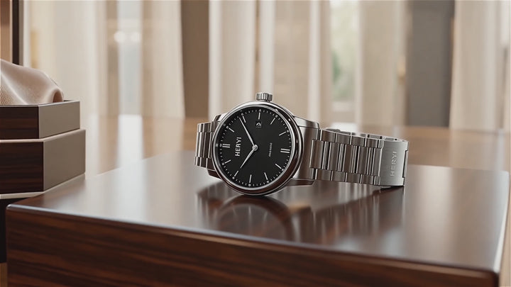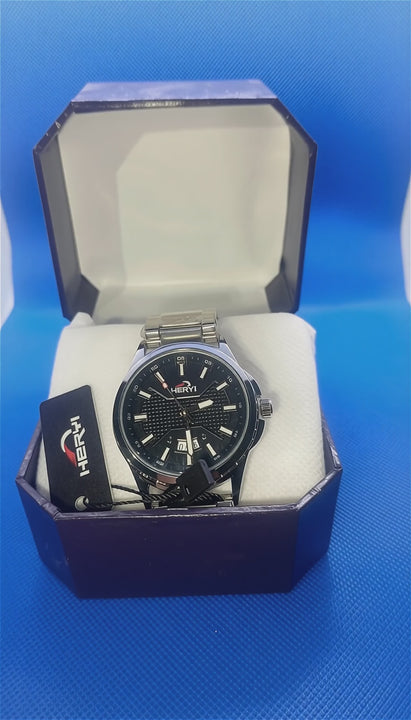 Captured in a professional studio setting against a neutral gray backdrop, this HERH timepiece embodies luxury and precision. Its polished stainless steel case and sleek integrated link bracelet exude a modern, sophisticated aesthetic, ideal for both formal and casual wear. The deep black dial features a textured, sunray-inspired pattern with subtle dot detailing, adding depth and refinement. Luminous rectangular hour markers and hands ensure optimal readability in low light, while a bold red-tipped second hand introduces a dynamic contrast. The brand name “HERH” is prominently displayed beneath a sleek logo, emphasizing its identity. A numerically marked outer bezel (ranging from 10 to 80) enhances the watch’s sporty elegance, complementing its precision engineering.