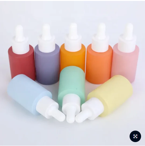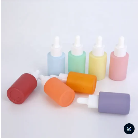 Customizable 20ml,30ml, and 50ml flat shoulder frosting colorful glass dropper bottles with essential oil application. Features include frosted, clear, and colorful bottle options, custom logo printing, silk screen, and hot stamping